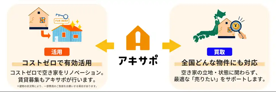 「アキサポの買取」では、「アキサポ」が直接空き家を買い受ける買取サービスを展開しております。 |