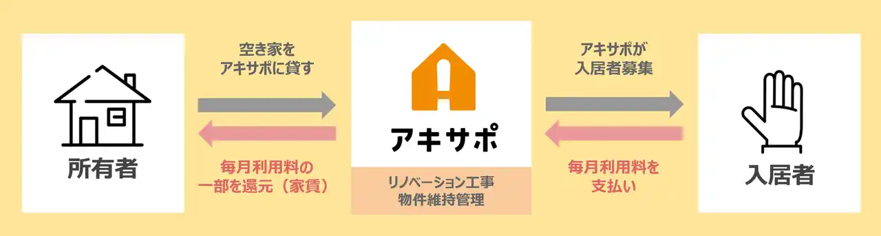 首都圏と関西圏を中心に展開する空き家活用サービスで、「アキサポ」が提供するサービスの一つです。 |
