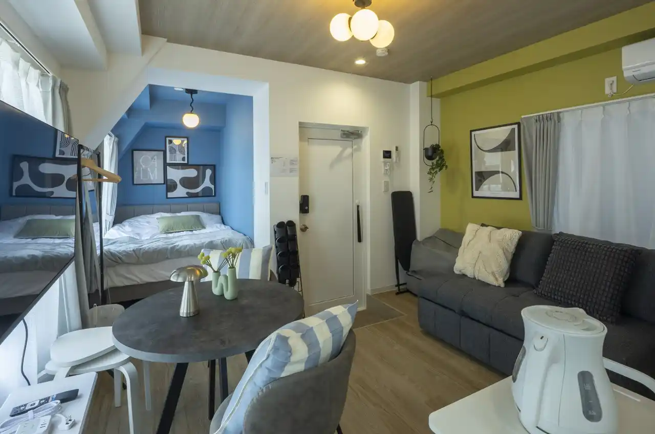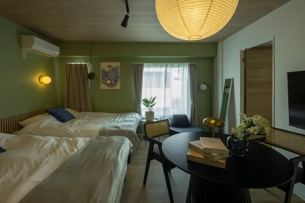 内装は運営会社の株式会社BISKが担当し、フロアごとに異なるコンセプトカラーを設定、「写真映え」と「居住性」を両立させた空間が広がっています。2階のコンセプトカラーは「ダスティローズ」で温かみのある北欧モダンをイメージ、3階は「セージグリーン」をアクセントに清潔感のある自然な空間を演出、4階は「ライトブルー」や「イエロー」を選び、屋根の形状を活かした隠れ家のような遊び心を加えました。家具や小物にもこだわり、丸テーブルによる生活動線の確保、吸音ボードを兼ねた3階のヘッドボード、柔らかな光を灯すボール状の照明、コンセプトカラーと連動したアートやクッションといった小物など、実用的な意匠を細部まで追求しました。 |