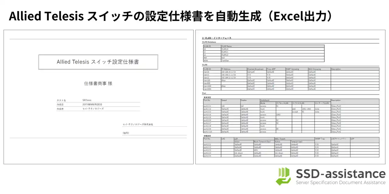 セイ・テクノロジーズ株式会社 (本社:東京都文京区、代表取締役社長:三瓶 千里、以下「セイ・テクノロジーズ」) は、累計 500 社以上に導入され、継続率 97% 以上を維持しているサーバー設定仕様書自動生成サービス「SSD-assistance(以下「SSDA(エスダ)」)」をバージョンアップし、アライドテレシス株式会社(以下「アライドテレシス」)が提供する「x シリーズ」に対応したことを発表します。 |