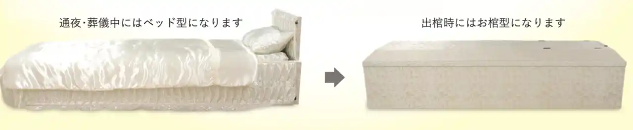 故人と参列者の心理的距離を縮めることで、お別れをより温かいものにできるのではないかと考え、オリジナル棺「ラストベッド」が生まれました。箱型の棺では、参列者が故人の顔を見たり声を掛けたりする際には、必ず上から覗き込むことになります。ラストベッドでは、いつものようにベッドで寝ている故人に話しかけるように、お別れをすることが可能です。 |