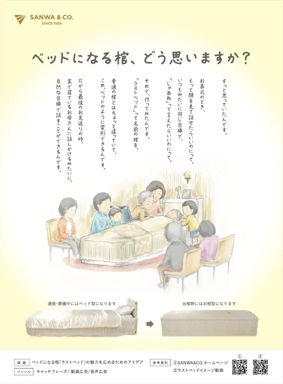 この度は第63回「宣伝会議賞」において、三和物産の課題に関心をお寄せいただき誠にありがとうございました。日頃あまり意識することのない「棺」。さらにはそれが「ベッドになる」という、一見すると想像しづらいテーマにもかかわらず、興味を持ってご応募くださった皆様に、心より御礼申し上げます。 |
