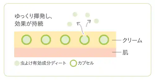 | ・アルコール不使用のクリームタイプなので有効成分<ディ―ト>がゆっくり揮発し、虫よけ効果が続きます。 | ||||||||||||||