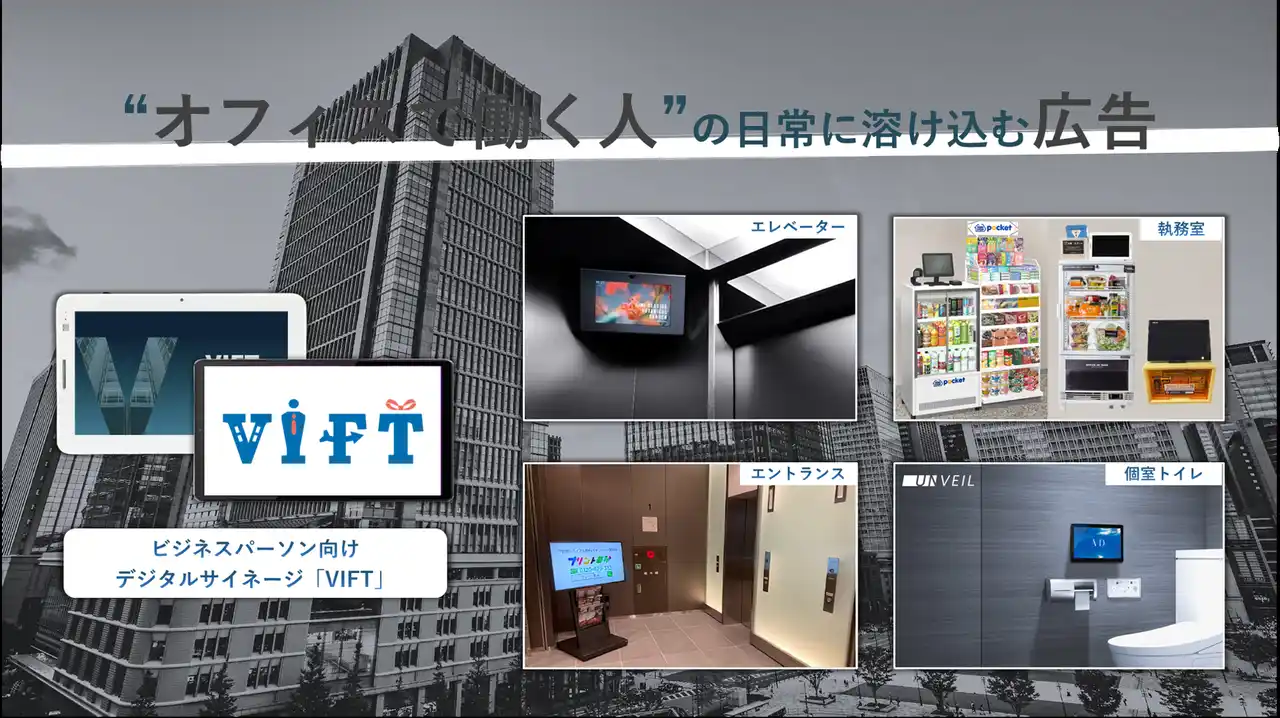 VIFT はあらゆるロケーションでビジネスパーソンにアプローチすることが可能なデジタルサイネージ広告です。 |