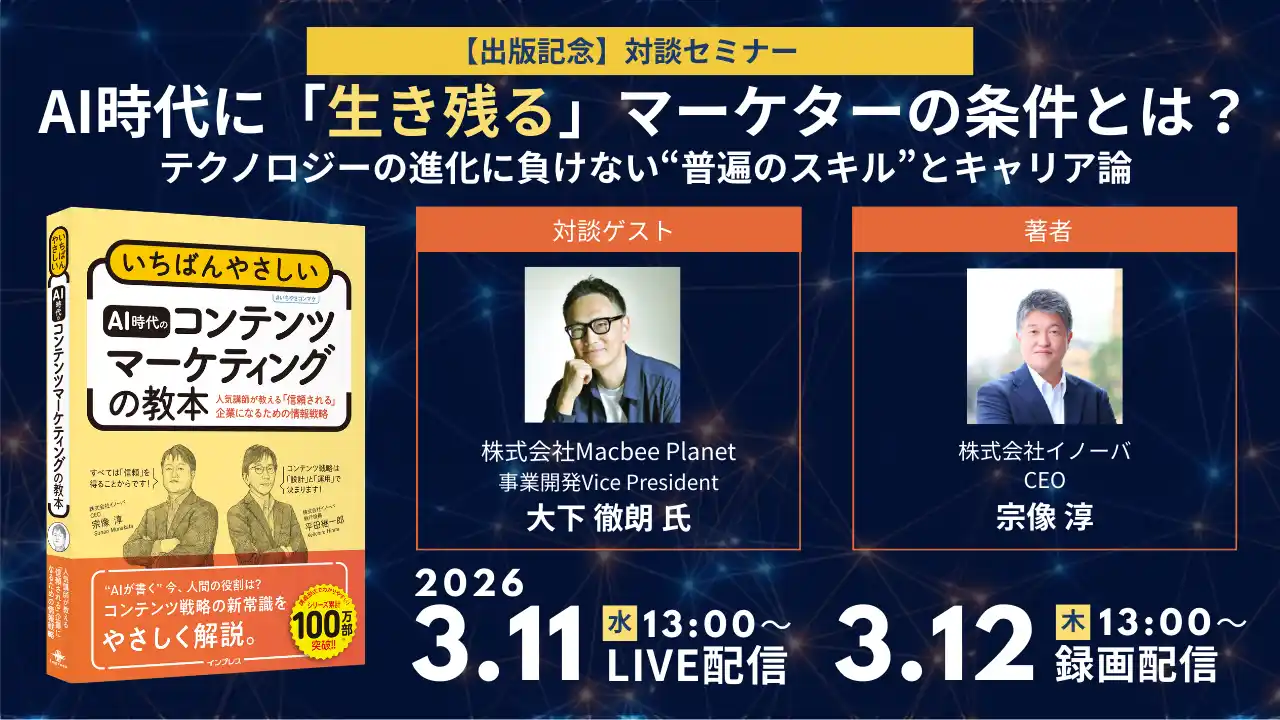 株式会社イノーバ(本社:東京都新宿区、代表取締役:宗像 淳、以下イノーバ)は、2026年3月11日に実施された『いちばんやさしいAI時代のコンテンツマーケティングの教本』出版記念セミナー「AI時代に“生き残る”マーケターの条件とは?テクノロジーの進化に負けない“普遍のスキル”とキャリア論」のレポートを無料公開しました。 |