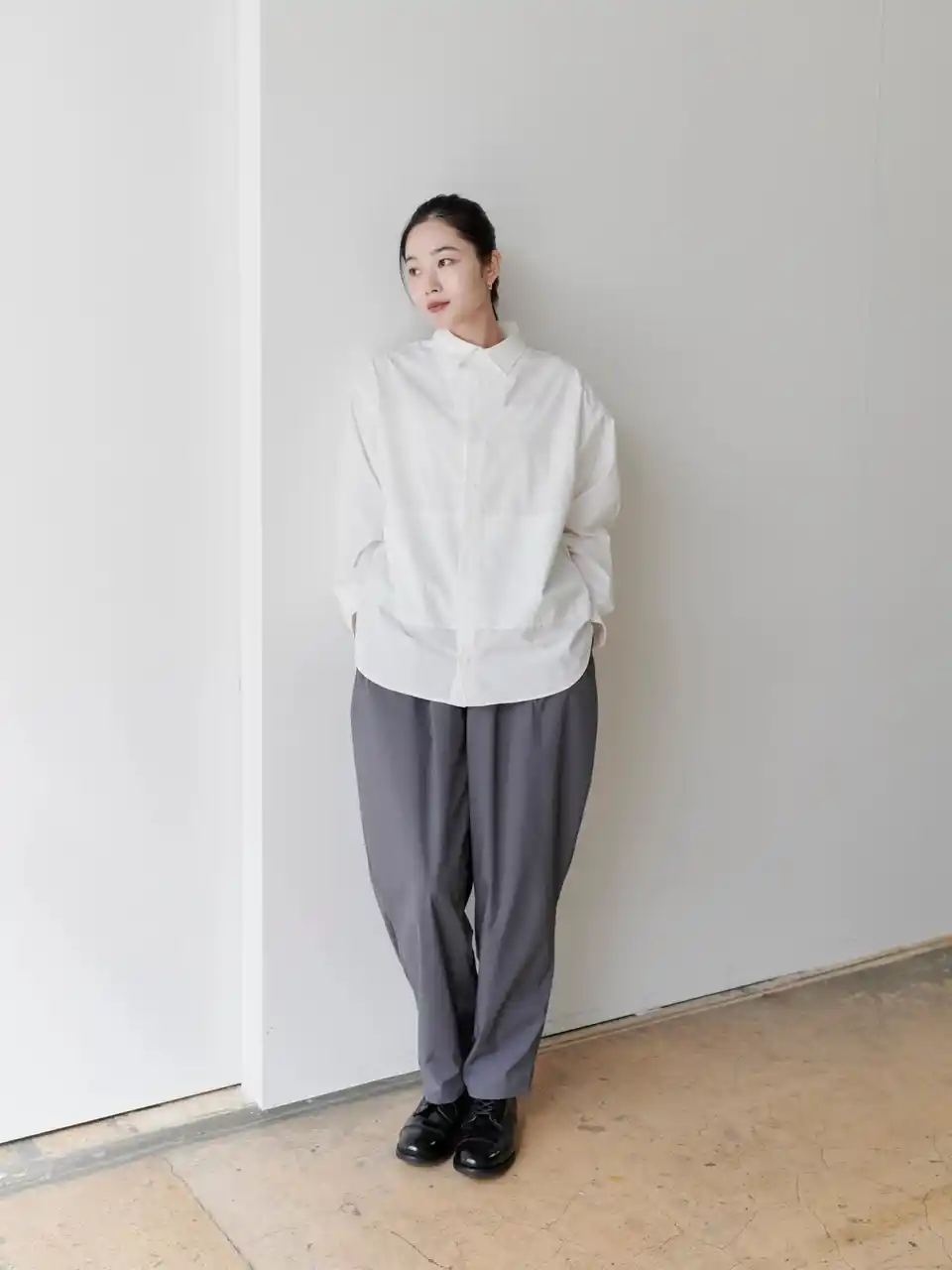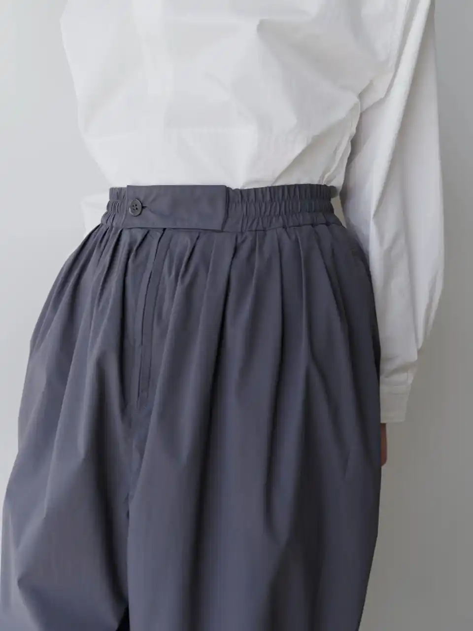 lelill人気のワイドトラウザー。 ドライな風合いと立体的な内向きタックが生み出す、美しい腰まわりのラインが特徴。 ゆとりがありながらも品よくまとまる、大人のためのワイドシルエットです。 |