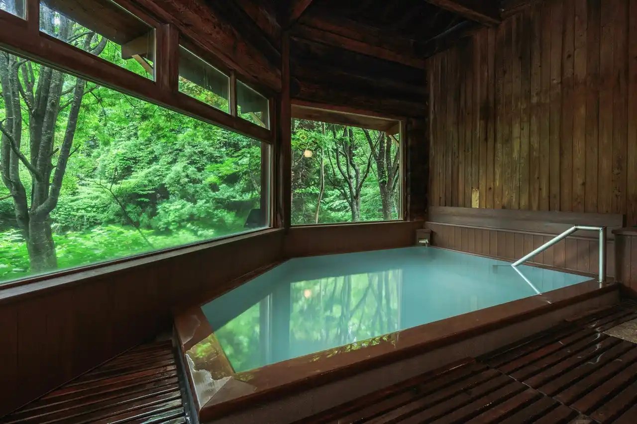 蔵王の新緑を眺めながら至福の時間「丸太造りの温泉」 |