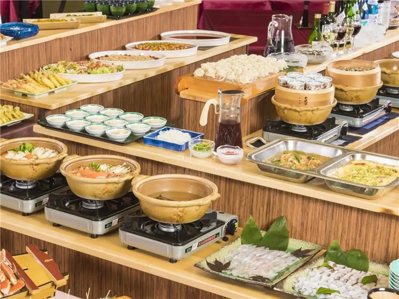 ズワイガニ90分食べ放題「庄内もっけバイキング」 約20種類の庄内グルメ食べ放題メニュー ・海鮮しゃぶしゃぶ ・庄内三元豚のしゃぶしゃぶ ・海鮮炭火焼 ・帆立イカ肝ソース焼き ・海藻三種の味噌汁 ・郷土鍋 ・庄内野菜の季節サラダ ・庄内米 ・季節のスイーツやケーキ など |