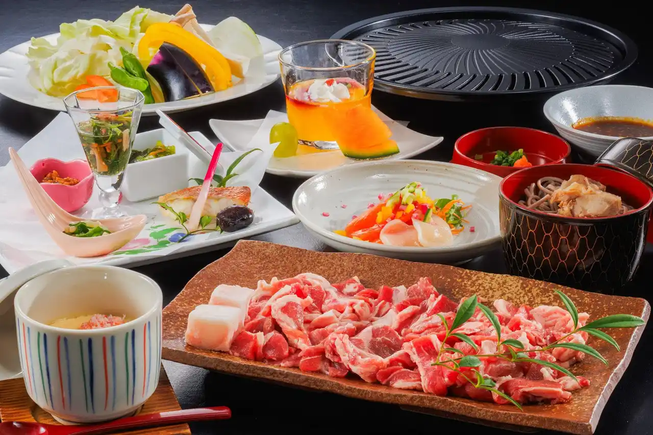 お好みで選べる2つの名物料理 ・蔵王名物ジンギスカン膳:ジンギスカン発祥の地と呼ばれる蔵王で味わう、ジューシーな生ラムの鉄鍋焼き ・米の娘ぶたしゃぶしゃぶ膳:豚肉品評会で日本一にも輝いた「米の娘ぶた」を味わえる |