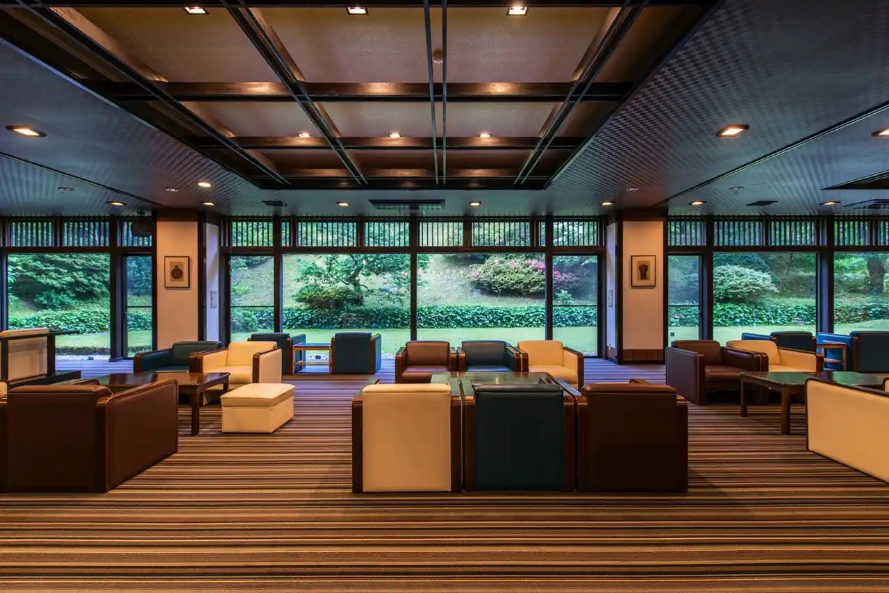【山庭ラウンジ】久遠の象徴的なラウンジ。四季の移ろいを眺める寛ぎの時間を |