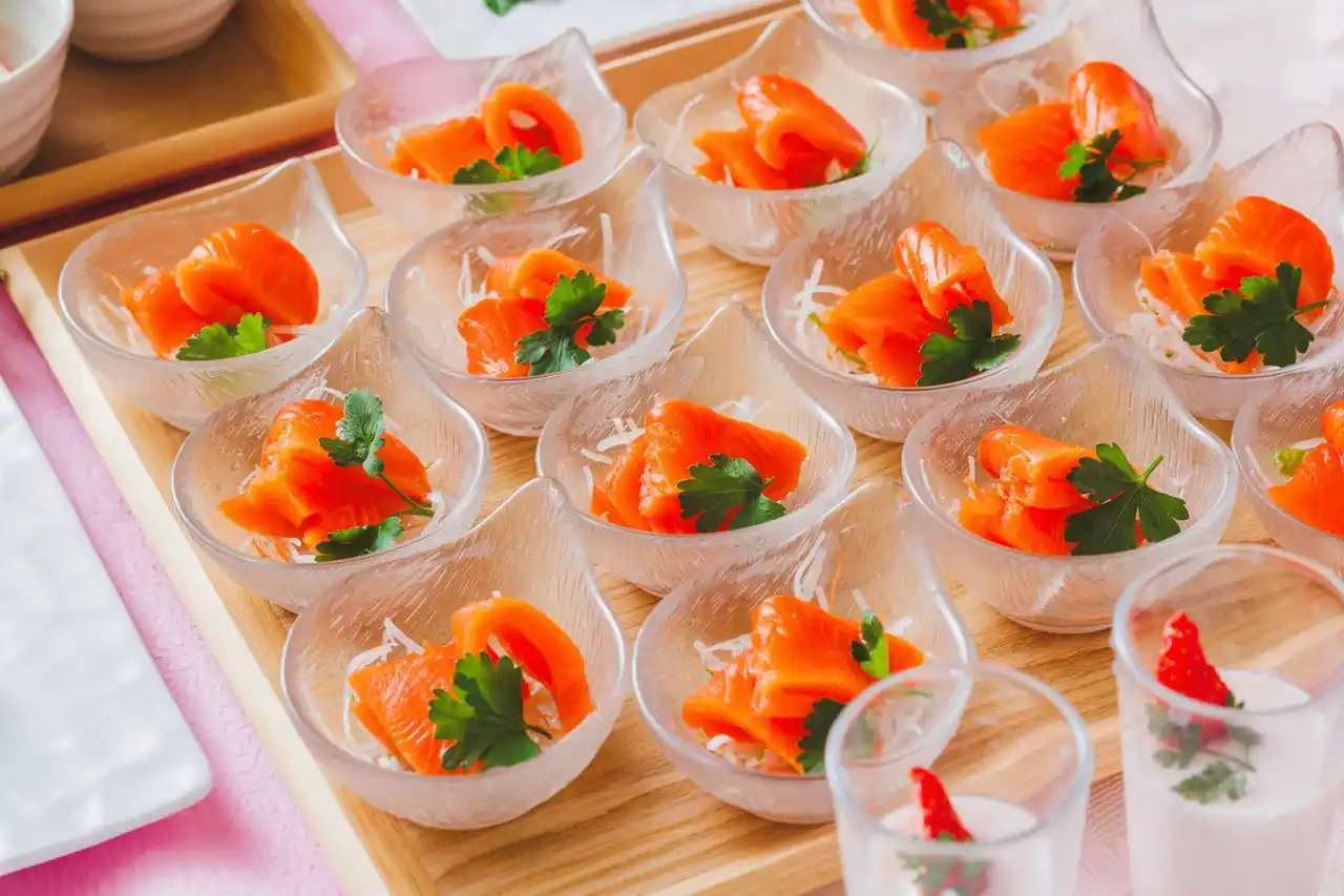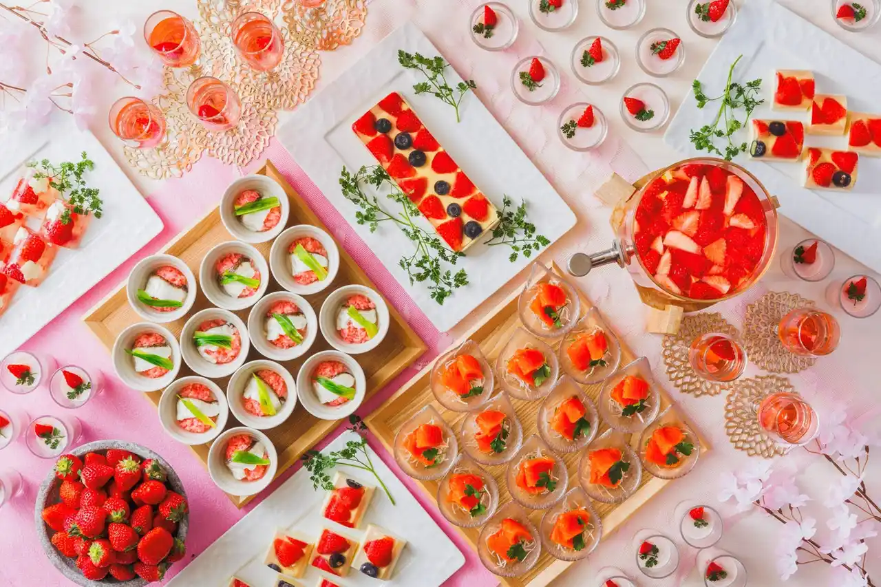 「ニジサクラ」の刺身や鯛の桜蒸し、苺のデザート、JURIN特製カレーなど、約10種の春限定ハーフビュッフェを用意。地元食材を取り入れた多彩な料理で、山形ならではの味覚を楽しめます。メイン料理は、薪火で香ばしく焼き上げた蔵王和牛フィレの薪グリルへアップグレードできるのも魅力です。 |