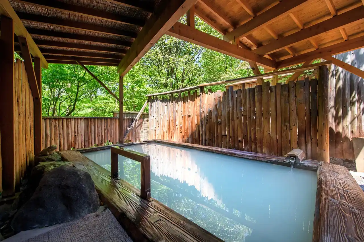 【露天風呂「葉がくれの湯」】木陰から射す日差しや蔵王の高原の風を感じ、源泉掛け流しの温泉を満喫 |