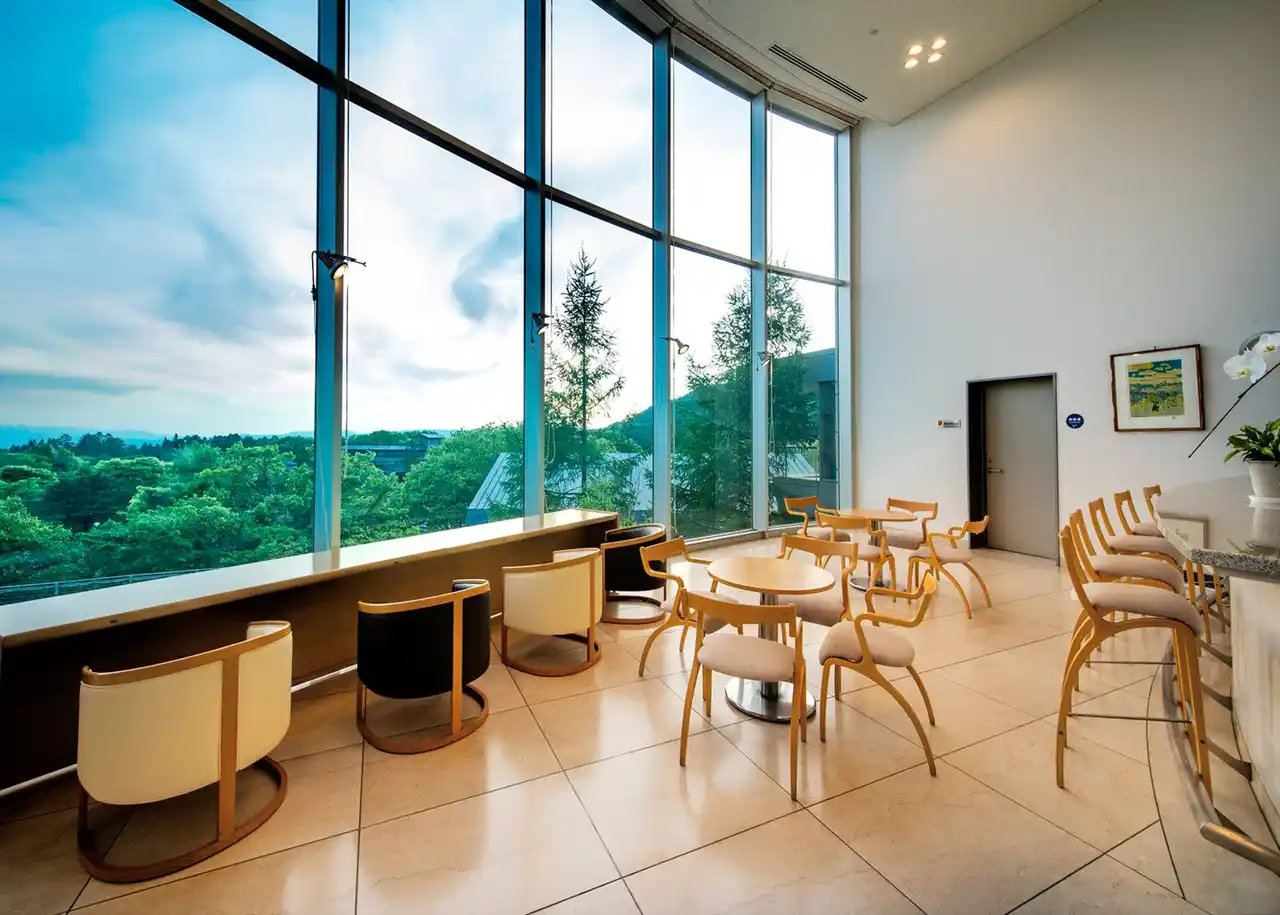 【ラウンジ「ヒルサイドテラス」】大きな窓からは美しい四季の絶景を眺められます |