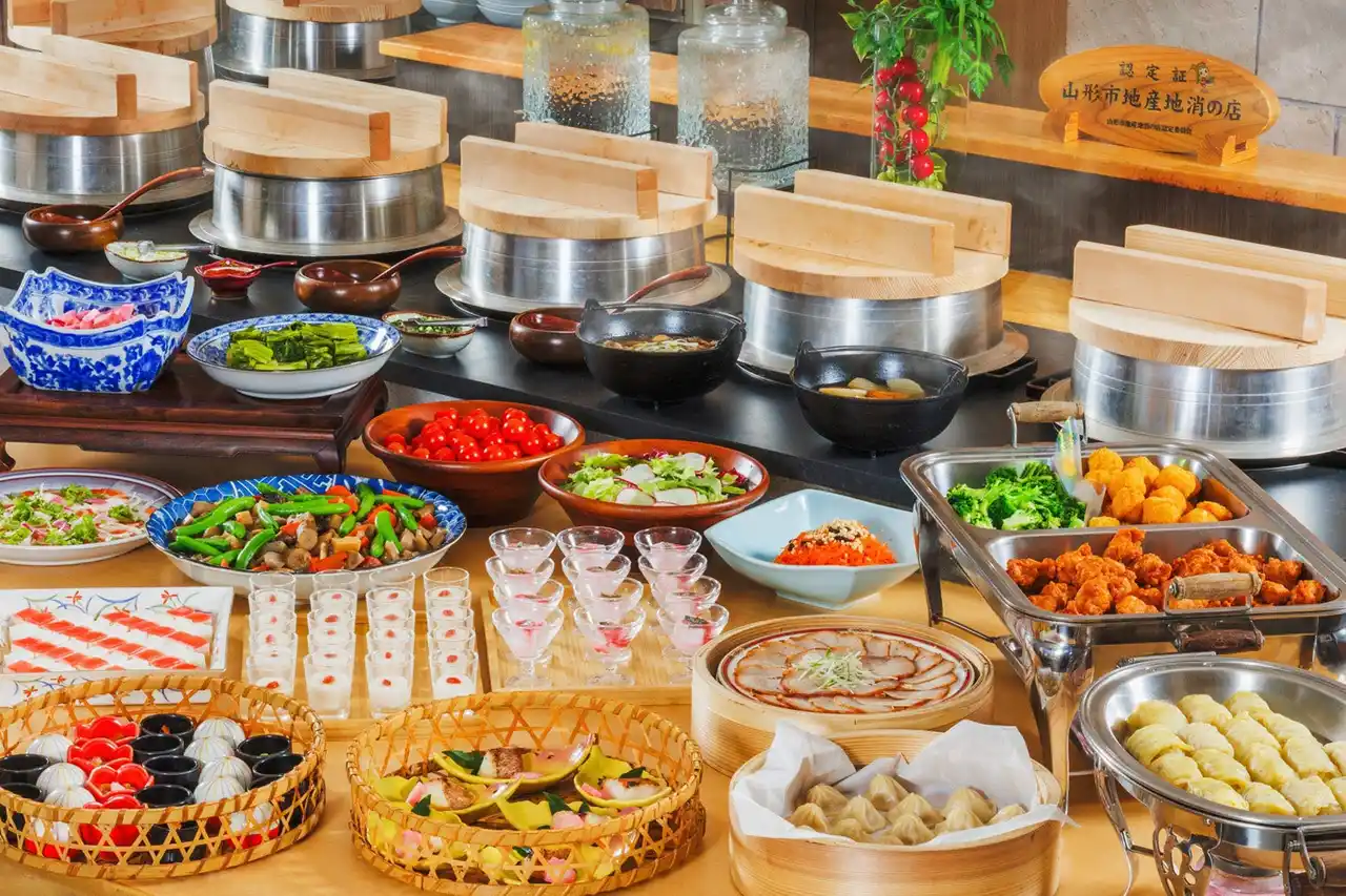 蔵王牛のしゃぶしゃぶをはじめ、春の前菜や山形のご当地の味覚を、かまど風の演出で楽しめる「かまどビュッフェ」。約20種の料理が並び、山形の食の魅力を存分に堪能できます。さらに、男山・出羽桜・東光・タケダワイナリーなどから選べる地酒が1杯付きです。 |