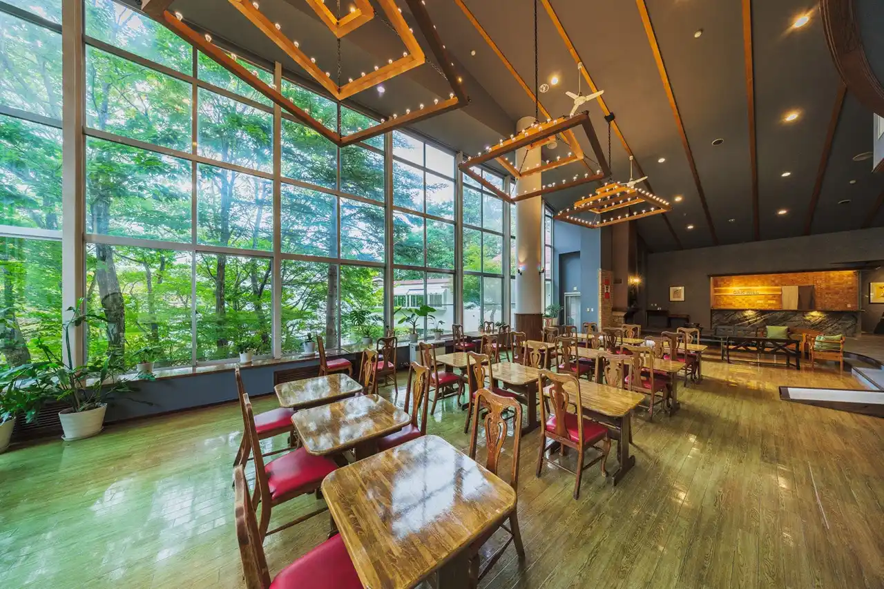 蔵王温泉街まで徒歩約5分、丘の上に建つ、B&BスタイルのONSENリゾート。開放的なガラス窓と森に抱かれたラウンジではリゾート感たっぷりの朝食を宿泊者には無料で提供。 |