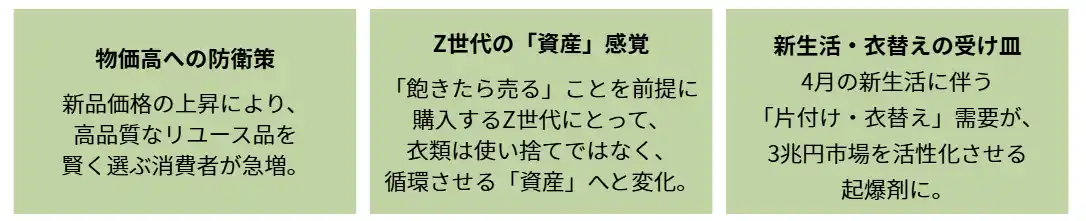 | 特にZ世代の間では、フリマアプリでの売買を前提とした「出口戦略のある買い物」が定着。もはやリサイクルは単なる節約術ではなく、「新生活を賢く彩るライフスタイル」へと進化しました。 | ||||||||||||||