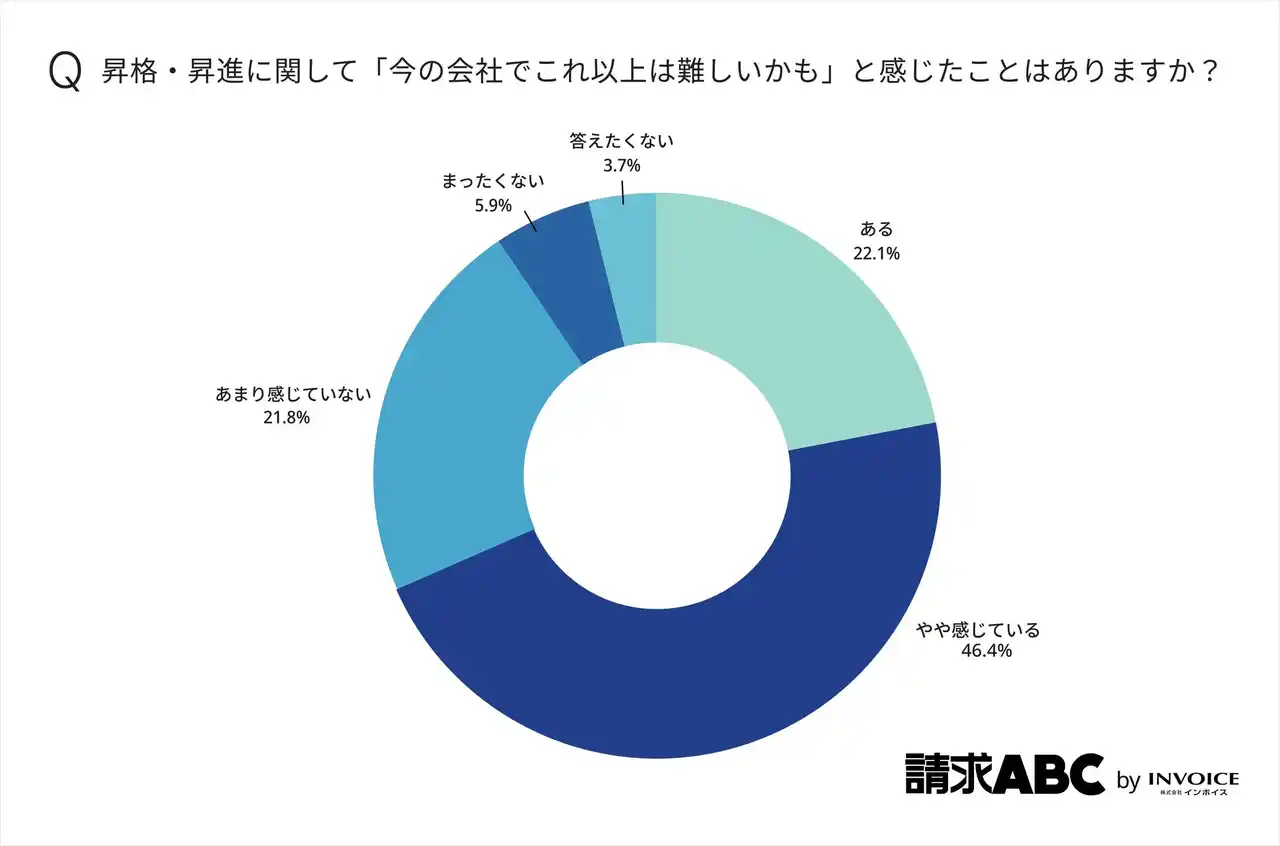 昇格・昇進に関して「今の会社でこれ以上は難しいかも」と感じたことがあるかの調査ついては、「やや感じている」(46.4%)が最も多く、「ある」(22.1%)と合わせると約7割にのぼります。 |