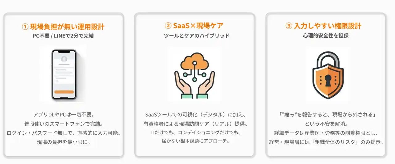 病院に行く前の“早期発見装置”として、デジタル(SaaS)による可視化を通じて現場の身体状態を把握し、企業が適切な対策を取れる環境を整備します。 |