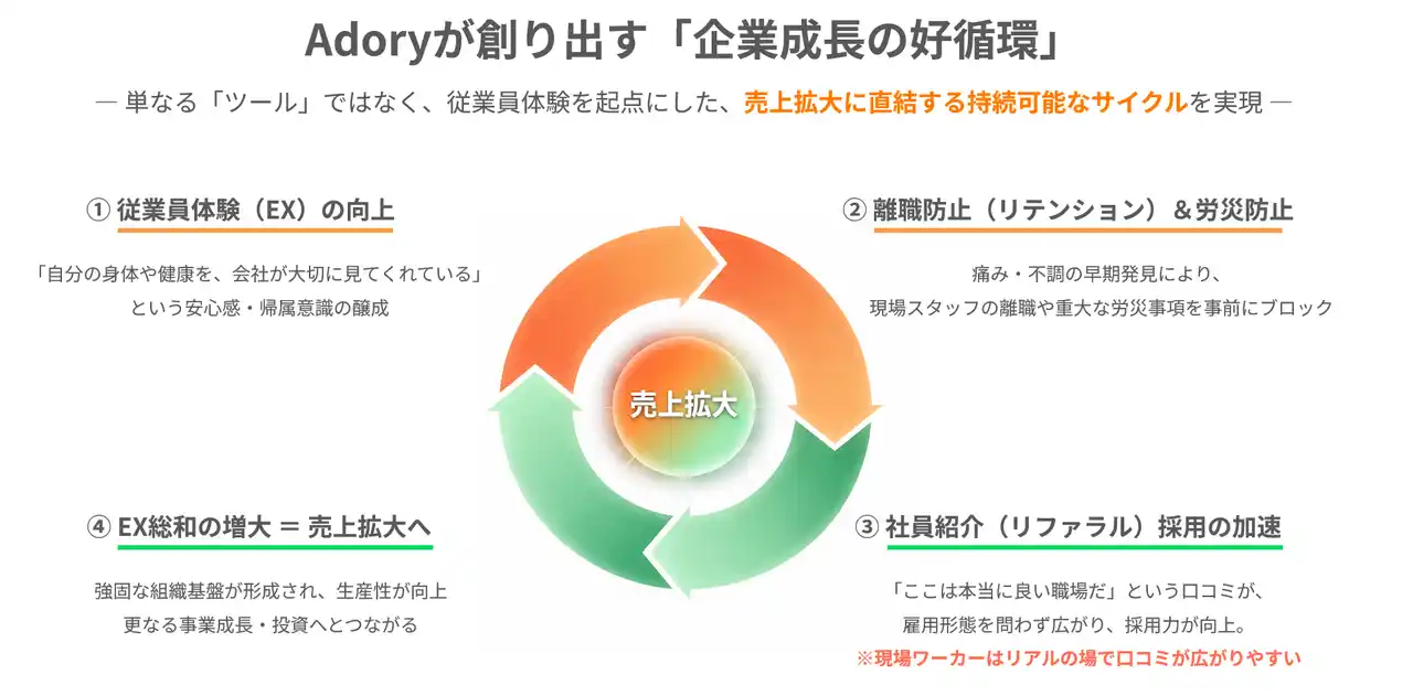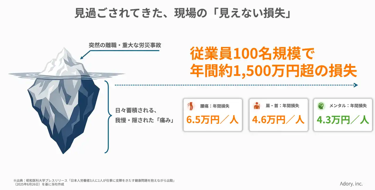 Adoryは、この身体の痛みが「個人責任」とされる文化を変え、身体のコンディションを企業の“重要な経営資本”として捉え、管理する世界を目指しています。 |