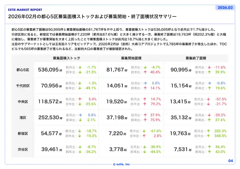 日本最大級の商業用不動産データ分析基盤「estie マーケット調査」を中心に複数のサービスを提供する株式会社estie(本社:東京都港区、代表取締役:平井 瑛、以下「estie」)は、「estie マーケット調査」による分析データをまとめた最新不動産マーケット動向レポート「エスティ マーケットレポート」2026年3月号を配信開始しました。 |