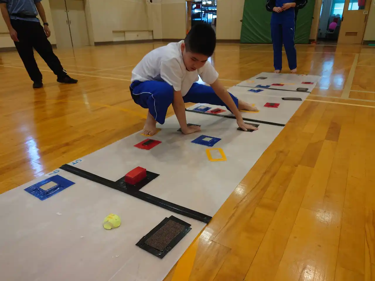 マークは、カーペット生地、発泡スチロール、段ボール、テニスボールなど、異なる素材と大きさで作成しました。2色のうち1色は「手マーク」、もう1色は「足マーク」とし、使用者は右手・左手・右足・左足のうち3つ以上を常にマークに乗せるというルールがあります。また、一度使ったマークには再度触れてはいけません。このルールの中で、どの順番で手足を動かすか、次の動きをどう考えるか、姿勢をどう保つかなど、楽しみつつ自然に運動能力や思考力を育むことができる教材です。このコース版以外にも簡易版、インクルーシブ版があります。 |
