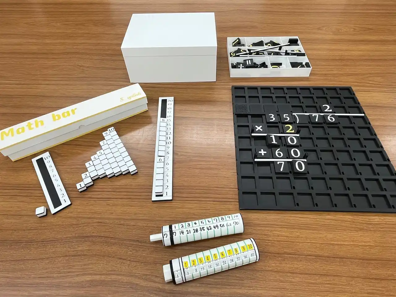 発達障害のある小学生の算数指導をする中で、生まれた3種類の教材で構成されています。(1)MathBar(マスバー)は、数の合成分解をブロックの操作によりサポートすることをねらいとした、数ブロックとスリットで構成された教具です。(2)MathPad(マスパッド)は、たし算、ひき算、かけ算、わり算の筆算をブロックの操作によりサポートすることをねらいとした数字ブロック、記号ブロック、小数点、横線とそれらを配置する板で構成された教具です。(3)九九Bar(ククバー)は、九九の想起をサポートするペンシル型の教具です。これらの教具を組み合わせて利用することにより、数概念、数操作、計算手続きの理解や流暢性を促すことを目的としています。 |