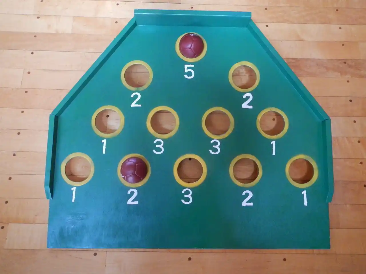 ボッチャを体育で行っていたが、得点が生徒にとって分かりにくく、ルールも難しい。そこで、スカットボールの台を基礎アイディアとしてボッチャボールを使って、穴に入った合計点で競う競技の教材を作成した。また、点数計算をExcelと電子黒板を使って、点数をわかりやすくした。 |