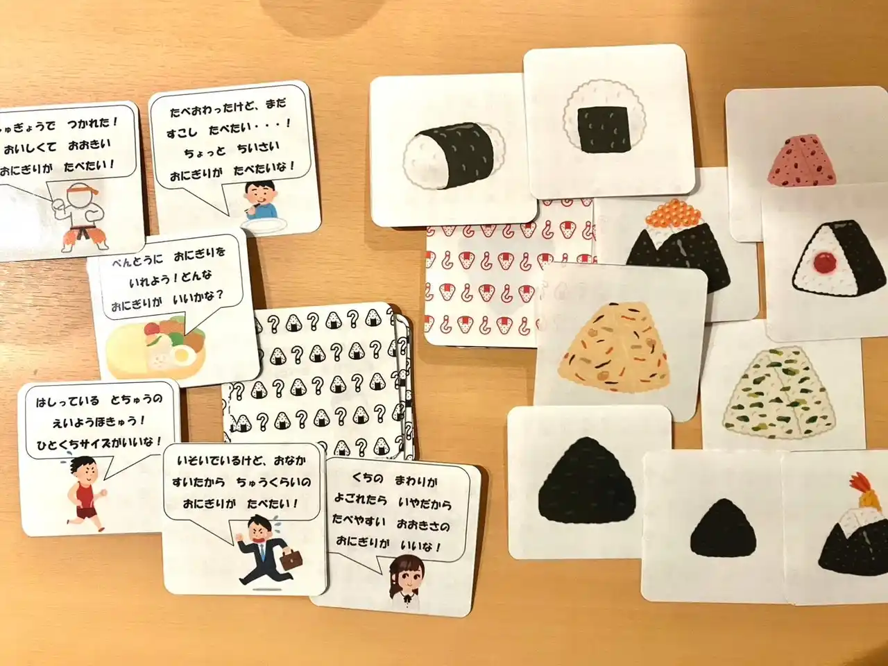 親が引いたカードに書かれたお題に沿ったおにぎりカードを自分の手札から出します。親は、どのカードが最も最適かを選び、最後選ばれた回数が最も多い人が勝ちというカードゲームです。「〇〇なおにぎり」と、曖昧な文章に適したものというだけでなく、親がそのお題に対して、どのようなおにぎりがよいと考えているのかまで推理する必要があります。答えがはっきりしていないので、適したもの、さらには親の考えまで推理する必要があり、楽しみながら、抽象概念や相手の思いを想像する力を育てられると思い、作製しました。 |