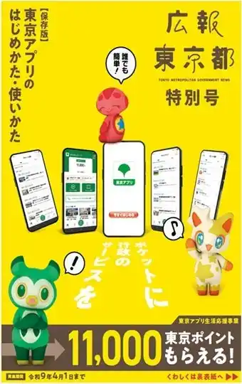 「東京都公式アプリ(東京アプリ)」は、東京都が2025年2月にリリースしたスマートフォンアプリで、都民の方一人ひとりがスマートフォンで行政とつながり、暮らしが便利になることを目指しています。この度、東京アプリの利用促進と都民のみなさまの暮らしを応援する「東京アプリ生活応援事業」も始まりました。多くの方にこの「東京アプリ」を使っていただくため、『【保存版】東京アプリのはじめかた・使いかた」と題し、東京アプリの登録手順や現行の機能、東京ポイント11,000ポイントがもらえる東京アプリ生活応援事業の申し込み方法までを図を使ってわかりやすくまとめました。「広報東京都特別号」を使って、東京アプリをダウンロードしませんか。ぜひお手に取ってお読みください。 |