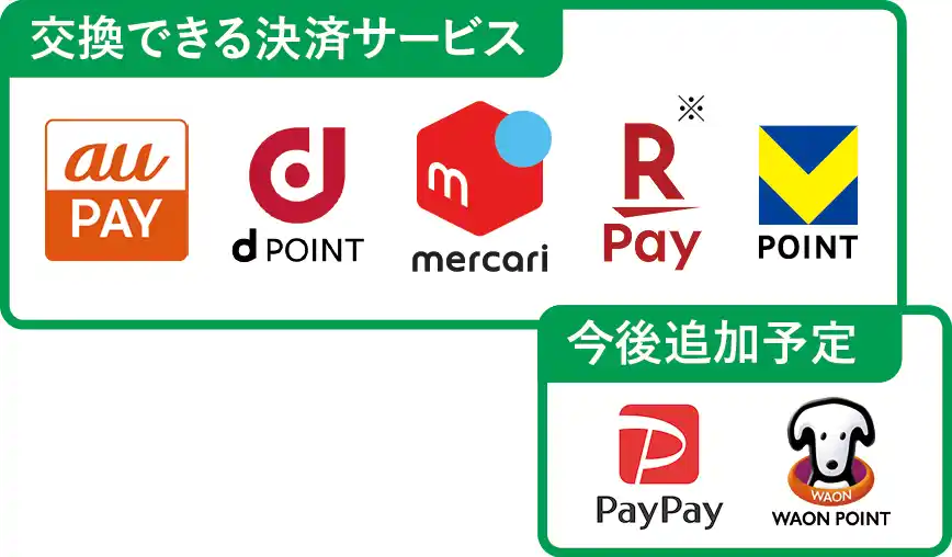 交換先も多数。キャッシュレス決済サービスのポイントなどに交換すれば日常のお買い物の支払いに使えます。 |