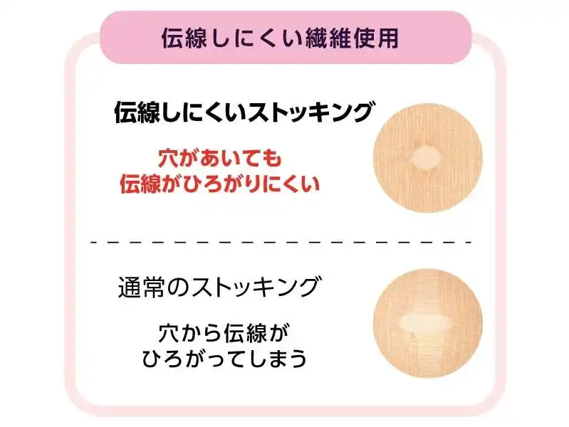 よく伸びるサポーティ糸で編み上げているので肌触りがなめらかで、肌なじみもよく適度なフィット感です。通常のストッキングとは異なり、穴があいても伝線がひろがりにくい繊維を使用していることも特長です。 |