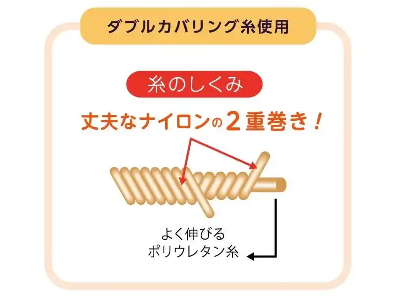 よく伸びるポリウレタン糸に丈夫なナイロン糸を2重に巻き付けたダブルカバリング糸を採用しています。ダブルカバリング糸とナイロン糸で交互に編み上げることにより、破れにくく丈夫な生地に仕上げました。ストッキングをはいてアクティブに動き回る方にもオススメです。 |