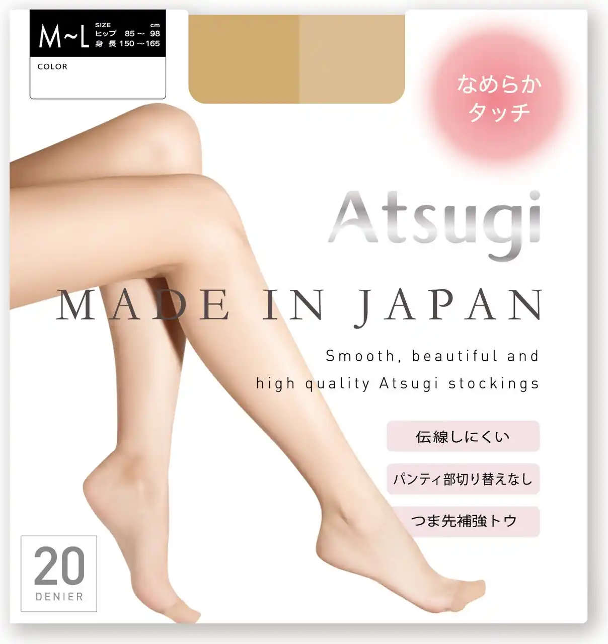 このような背景から、アツギは確かな品質を持つ日本製ストッキングを2026年春夏シーズンに発売いたします。肌触りがなめらかな「なめらかタッチ」と丈夫で破れにくい「丈夫でしっかり」の質感が異なる2型をご提案します。日本品質の快適なはき心地に加えて、丈の短いボトムスにも合わせやすいファッション性も両立させた、こだわりポイントをご紹介します。 |