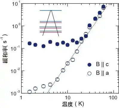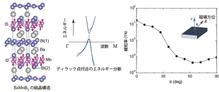 | ディラック半金属の中でも重元素からなる物質では、強いスピン軌道相互作用から相対論的な効果が期待されます。そこで、安定な元素の中で最も重いビスマス化合物(BaMnBi2)が理想的なディラック半金属であることに着目し、その磁気励起をNMRで微視的に調べました。Mnイオンは磁気秩序し強い磁化を発生するため、バルクの磁化測定ではディラック電子を直接見れませんが、NMRを使うとディラック電子のいるBiサイトを選択的に検出することが可能となります。 NMR緩和率の温度、磁場、方位依存性を詳細に調べた結果、動ける電子のエネルギーがディラック点近傍に位置することがわかりました。また、磁場下で軌道運動が量子化した状態の緩和率(B||c)が、磁場の影響のない状態(B||a)に比べて極低温で100倍以上にまで増大することを見出しました。これは二次元ディラック方程式に基づく理論計算から予想されたものよりはるかに大きく、スピン軌道相互作用によってスピン分極が増大した効果を考慮する必要があることを意味しています。 | |||||||||