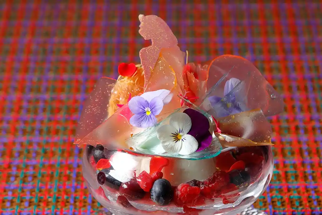 | デザートのトップには、クレオパトラを象ったチョコレートを飾り、その周囲には、ベリーダンスヴェールのようなピンクやブルーなどの華やかなフリル状の装飾を施しました。グラスの中には、美と知性、そして魅惑の象徴として知られるクレオパトラにインスピレーションを得たミックスベリーとハイビスカスのジュレ、ドライフルーツとハチミツを合わせたムースグラッセ、そしてヨーグルトで構成。さらにエジプト菓子「クナーファ」に用いられるカダイフをアクセントとして加え食感の変化も楽しめます。横に添えたローズソースで、香りと味わいを引き立てる華やかで優雅なデザートです。 | |||||||||||||||||||