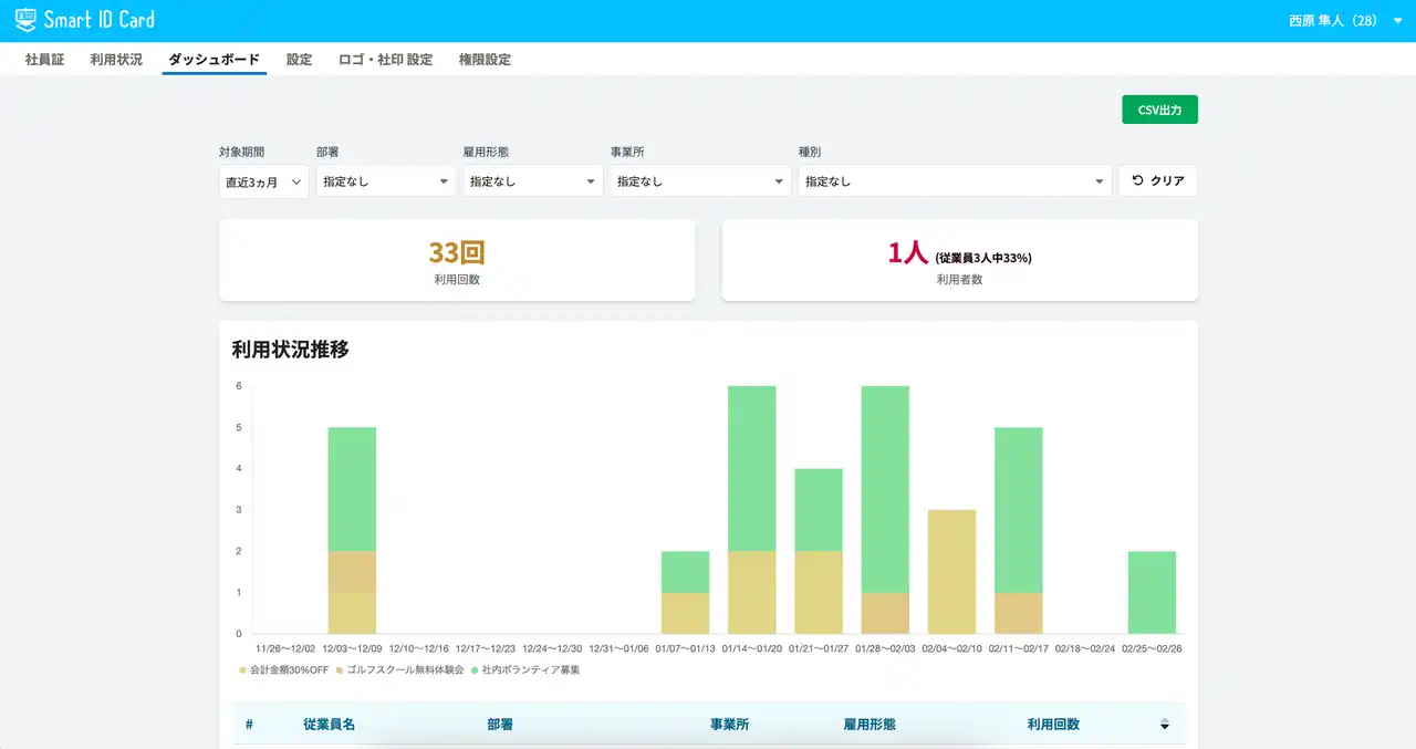 | ● 管理者は「クーポン」の利用実績を集計・可視化(CSV出力も対応可)することができ、利用傾向を分析し、福利厚生の見直し・最適化に役立てられます | |||