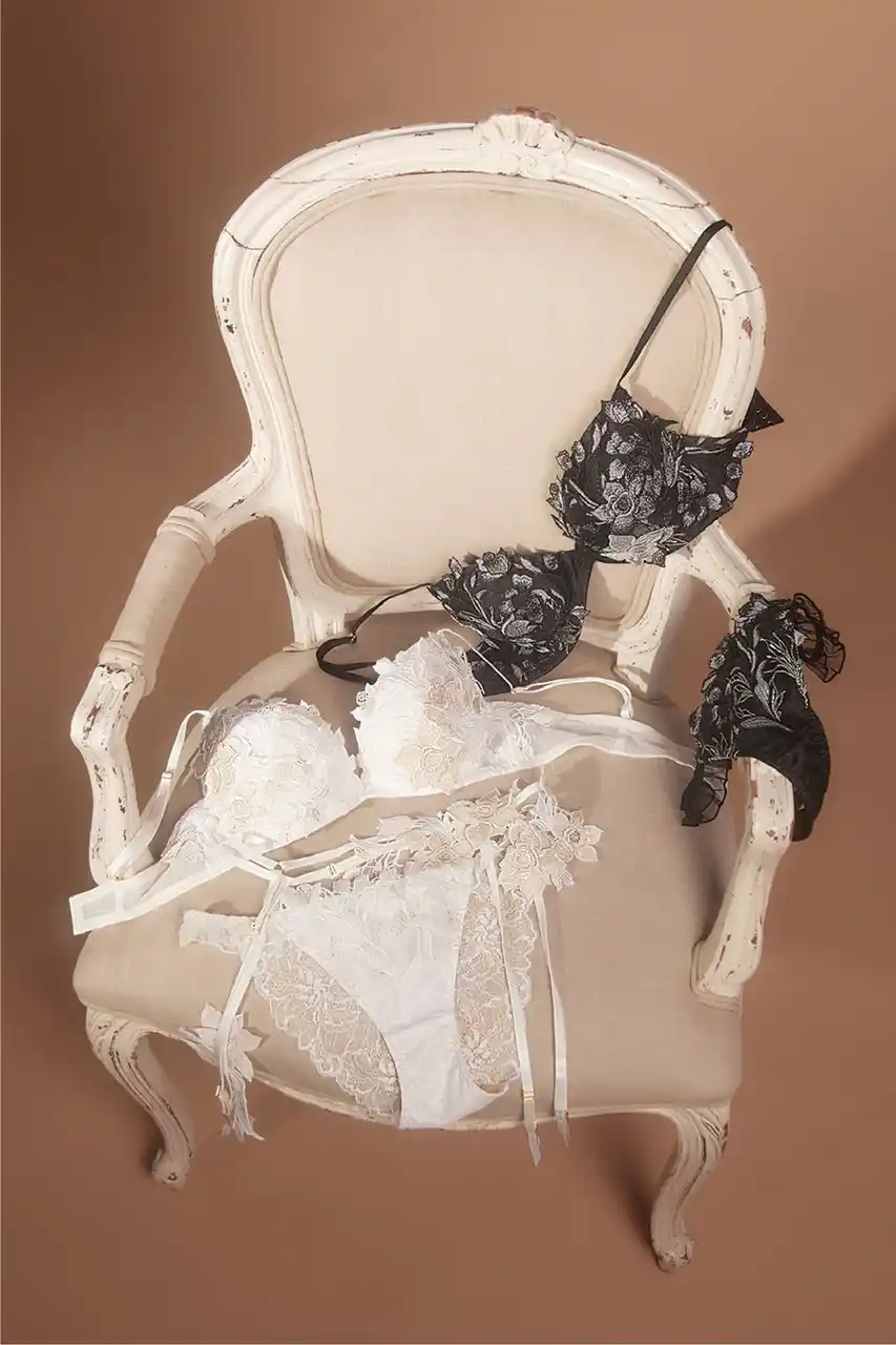 可憐さの奥に、揺るがぬ気品。 重なる花々が、胸元に静かに咲くブラ。 |