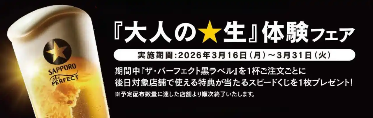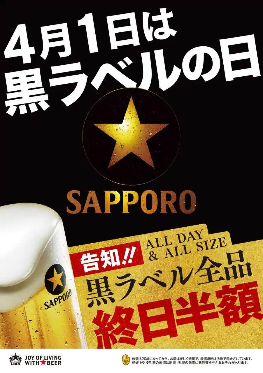 サッポロホールディングスのグループ企業である株式会社サッポロライオン(本社・東京都中央区、社長・田澤宏之)は、 2026年3月16日(月)~4月1日(水) の期間、「サッポロ生ビール黒ラベル」を取り扱うサッポロライオンチェーン各店(一部店舗除く)にて 、4月1日「黒ラベルの日」を記念したイベントを実施します。 |