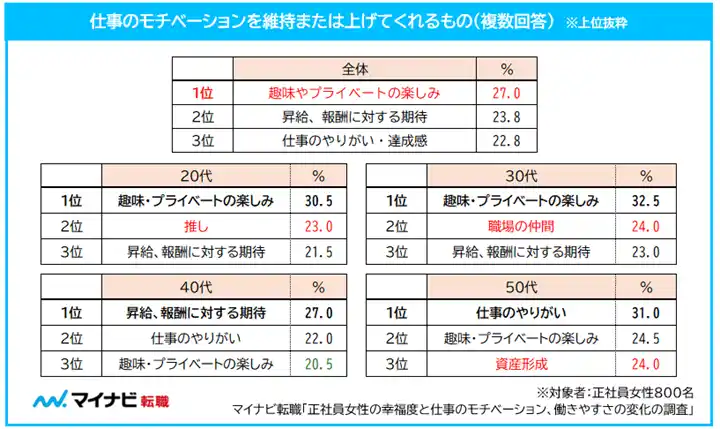◆仕事のモチベーションに繋がるものは「趣味」「昇給」が上位。年代別では20代は「推し」、50代は「資産形成」がランクイン |