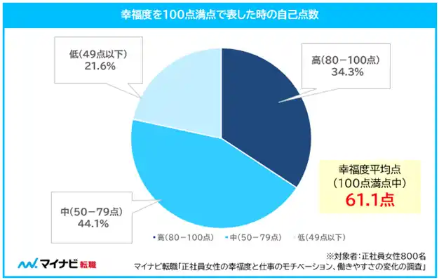 株式会社マイナビ(本社:東京都千代田区、代表取締役 社長執行役員:粟井俊介)が運営する総合転職情報サイト『マイナビ転職』(https://tenshoku.mynavi.jp/)は、正社員女性800名に聞いた、「正社員女性の幸福度と働きやすさの実態調査」の結果を発表しました。 |