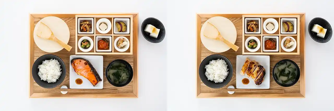 古式精米で磨き上げたブレンド米を主役に据えた「おひつ御膳 さけ」(写真左)と「おひつ御膳 とり」(写真右)。麹や無添加調味料を用いた副菜を添え、炊きたての香りと粒立ちを存分に味わえます。 |