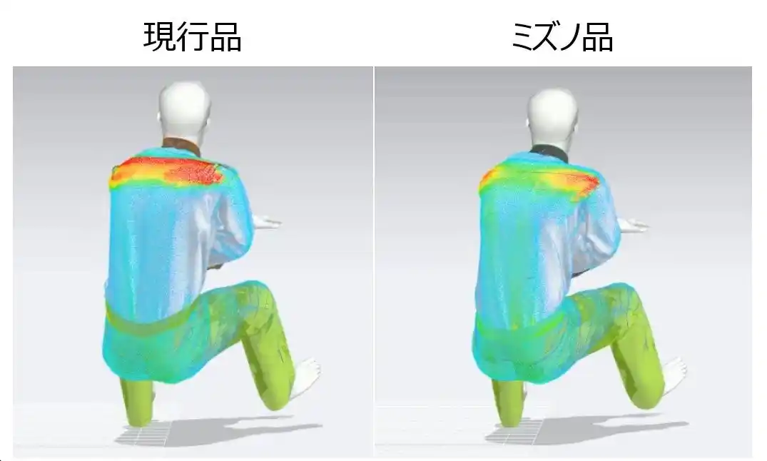人間工学に基づいた動作解析によるウエア設計で、作業時の動きやすさを追求しています。作業中の腕の曲げ伸ばしや肩の回旋、足の屈伸動作時の引きつれや圧迫感を軽減します。その結果、作業効率の向上を図っています。 |
