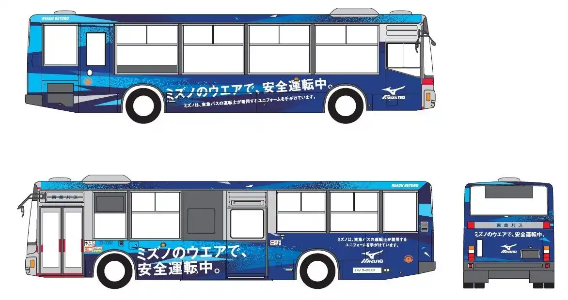 今回の両社の取り組みを記念し、日本に2台限定のミズノワーキングのデザインによるラッピングを施した東急バスが、2026年4月中旬以降順次、等々力操車所~東京駅南口の系統を含む目黒営業所所管路線にて6カ月間、期間限定で運行する予定です。 |