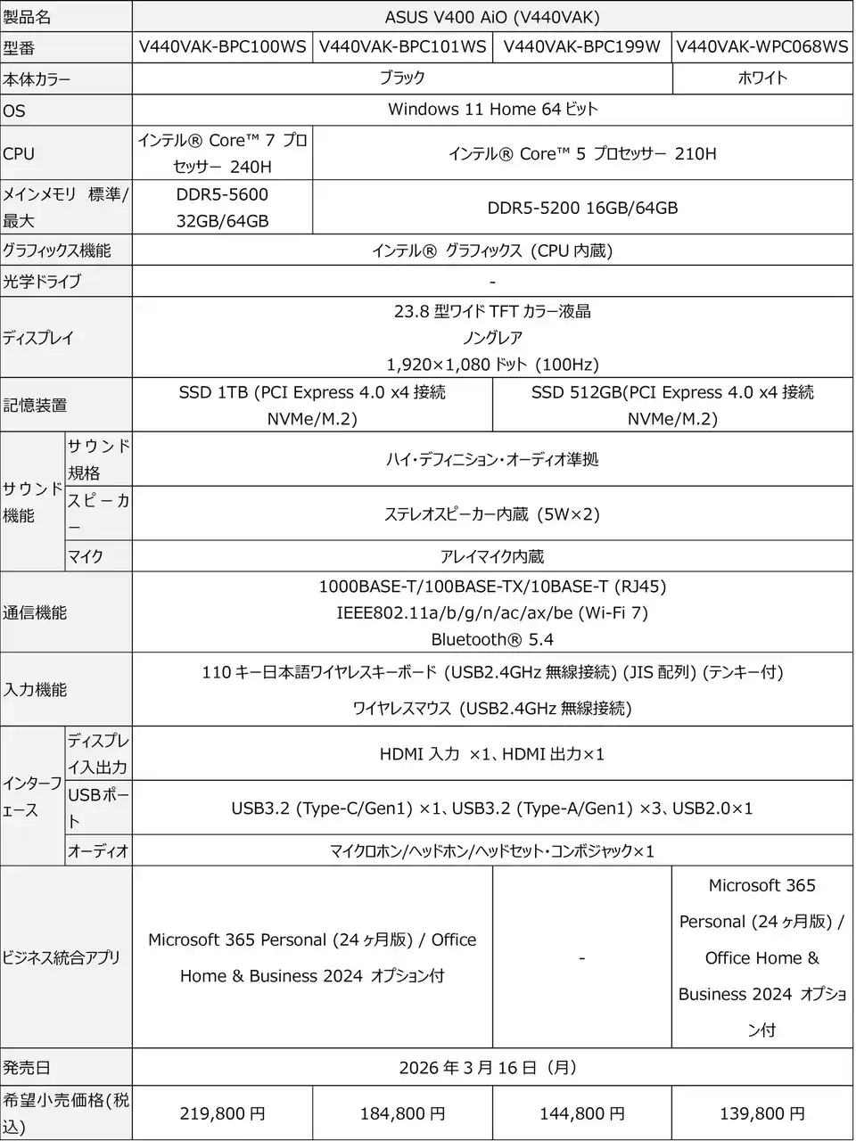 ASUS JAPAN株式会社は、日常に溶け込むシンプルで美しいデザインで、選べるサイズ、性能のオールインワンPC「ASUS V400 AiO(V440VAK/V470VAK)」に新しいスタンドデザインとHDMI入出力機能を備えた2製品6モデルを追加することを発表しました。インテル(R) Core(TM) 7 プロセッサー 240H、またはインテル(R) Core(TM) 5 プロセッサー 210Hと23.8型ディスプレイを搭載する「ASUS V400 AiO (V440VAK) 」に1製品4モデルと、大迫力の27型ディスプレイを搭載する「ASUS V400 AiO (V470VAK) 」に 1製品2モデルの計2製品6モデルを追加し、本日2026年3月16日 (月) よりASUSオフィシャルオンラインストアと一部量販店にて販売開始します。 |
