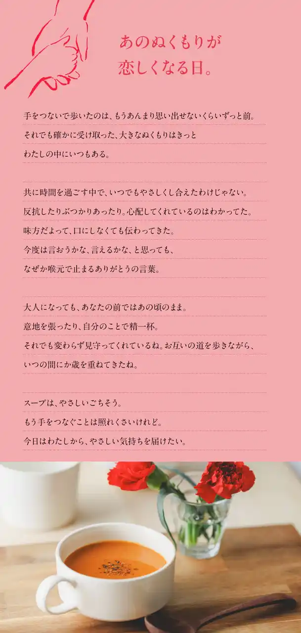 さまざまな食材が溶け込んだスープは、温かくて、身体にやさしくしみわたり気持ちもふっとほぐれる「やさしいごちそう」。「いつもありがとう」や「これからも元気でいてね」の気持ちを、スープと一緒に贈ってみませんか。 |