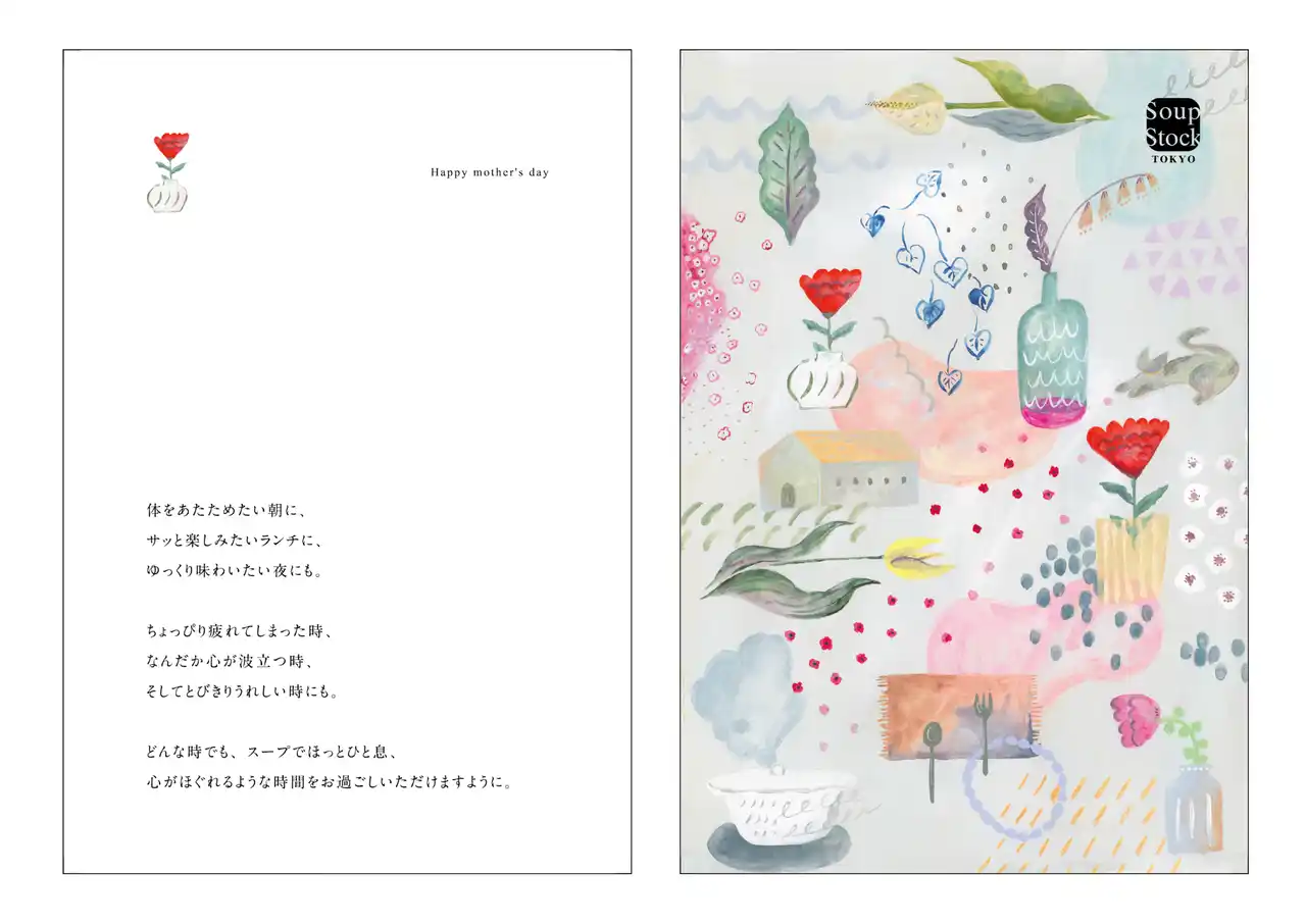掛け紙と同じデザインのポストカードに、母の日限定のSoup Stock Tokyoからのメッセージを添えたオリジナルのカードです。 |