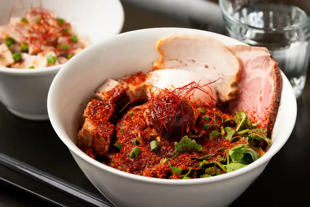 看板「麻婆まぜそば」を限定で「激辛」仕様に。3年熟成豆板醤のコクを軸に、2種の唐辛子とハバネロ、花椒、山椒油ブレンドの豆板辣油で辛味と痺れをブースト。麺は豚バラ煮汁の醤油ダレと油で先に和え、沈まないほど濃いトロミ麻婆餡を特注極太麺へ濃密に絡める。豚バラ&低温肩ロースの2種チャーシュー、長ねぎ・万能ねぎ、糸唐辛子で香りも刺激も全開。 |