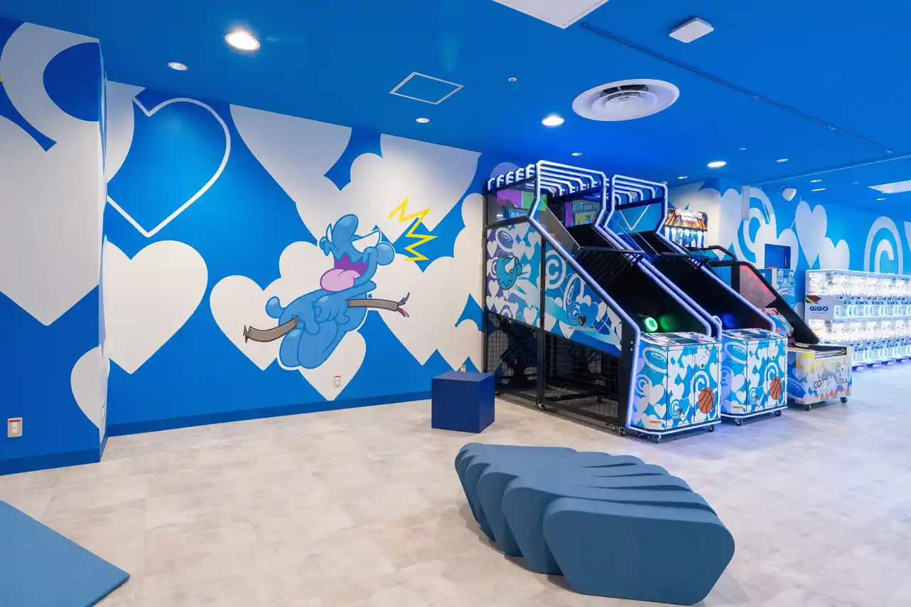 店内は「CPD」のメインキャラクター「白井さん」を軸にハートやモノグラム表現が展開され、ところどころに立体アートオブジェも登場。「CPD」デザインのクレーンゲームやバスケットボールゲームなどに加えて、「GiGOのたい焼き」の店舗デザインも「CPD」による特別仕様です。ここでは通常のたい焼きに加えて「CPD」のキャラクター「白井さん」をモチーフにした“青い”たい焼き「コインパーキングデリバリーコラボ焼き」も販売します。 |