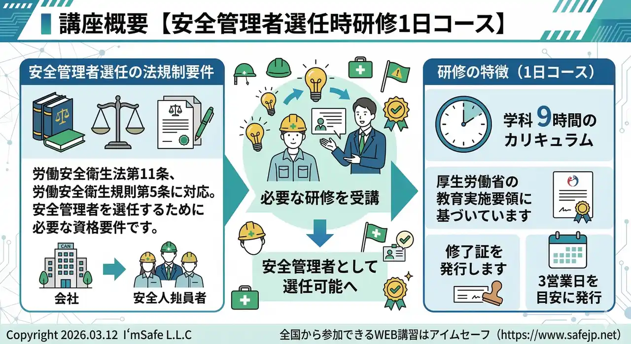労働安全衛生法第11条の安全管理者の資格要件である労働安全衛生規則第5条に対応する安全管理者を選任するのに、必要な研修です。 ※厚生労働省の教育実施要領に基づいた学科9時間の修了証を3営業日を目安に発行します。 |