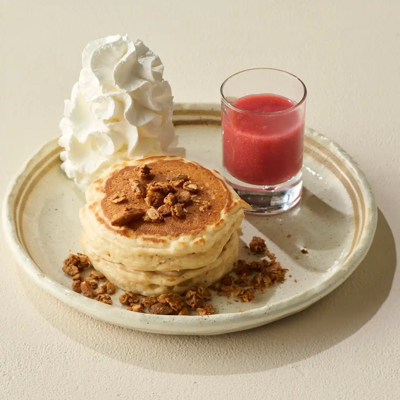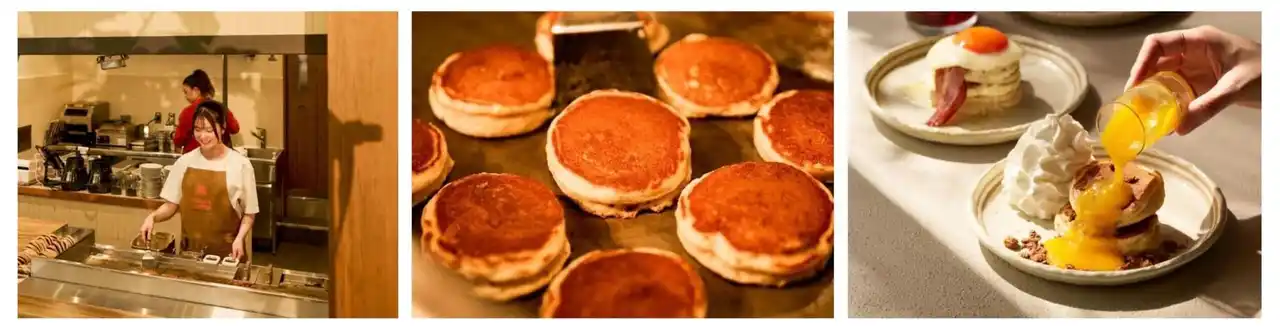 店内には、パンケーキが一枚ずつ丁寧に焼き上がる様子を目の前で楽しむことができる、ライブ感たっぷりな「パンケーキバー」をご用意。鉄板の上で生地がふわっとふくらみ、焼き色がついていく音、香ばしい香りが広がるライブ感と、できたてのパンケーキが味わえます。パンケーキは一枚から注文可能。素材の味をシンプルに楽しむのはもちろん、ベーコンに目玉焼き、ホイップクリームにチョコレートソースなど、お好みのトッピングとの組み合わせもおすすめです。さらに、目の前でバーナーを使って仕上げるトリュフバターパンケーキやブリュレパンケーキなど、多彩なメニューをご用意しています。 |